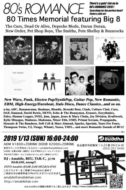 ¢£ 1/13 (Æü) 80's ROMANCE 80 Times Memorial featuring Big8 16:00-24:00 @ club buddha http://www.clubbuddha.com/ ̾¸Å²°»ÔÃæ¶è¿·±É1-5-25Âè2M¥Ó¥ë6F TEL : 052-251-5450 Á°Çä¤ê 1800±ß+2¥É¥ê¥ó¥¯ ÅöÆü 2000±ß+2¥É¥ê¥ó¥¯ DJ : Amabile, REU, TAK-C, ¦Ìra Guest DJ : ¤Ï¤«¤», nozap!! 99ǯ9·î13Æü¤Ë¥¹¥¿¡¼¥È¤·¤¿80's ROMANCE(̾¸Å²°)¤â¡¢¤Ä¤¤¤ËÀáÌܤȤʤë80's¤Î80²óÌܤò·Þ¤¨¤Þ¤¹¡£ ¤³¤ÎÆü¤Ï80's ROMANCE¤Ç¿Íµ¤¤¬¹â¤¤8ÁȤΥ¢¡¼¥Æ¥£¥¹¥È¤ò¥Õ¥£¡¼¥Á¥ã¡¼! Cure¡¢Dead Or Alive¡¢Depeche Mode¡¢Duran Duran¡¢New Order¡¢Pet Shop Boys¡¢