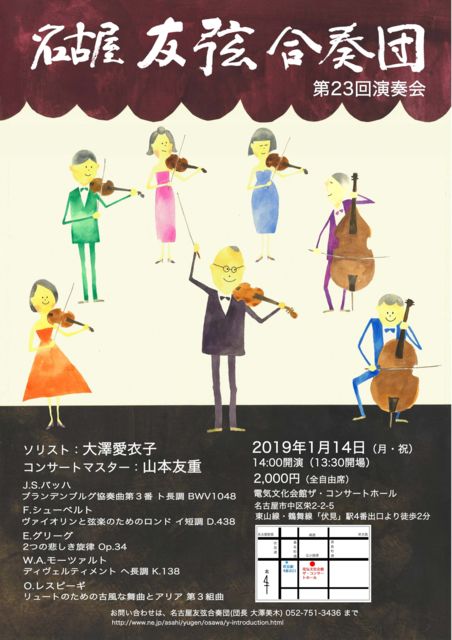 名古屋で活動しております「名古屋友弦合奏団」と申します。 来年1月にコンサートを執り行わせていただくことになりましたので、ご案内いたします。 ------------------------------------------------------ ”名古屋友弦合奏団 第23回演奏会” 2019年1月14日(月/祝) 14時開演(13:30開場) ソリスト;大澤愛衣子 コンサートマスター:山本友重 電気文化会館ザ・コンサートホール 愛知県名古屋市中区栄2-2-5 東山線・鶴舞線「伏見」駅4番出口より徒歩2分 入場料:2,000円(全自由席) (曲目) J.S.バッハ:ブランデンブル