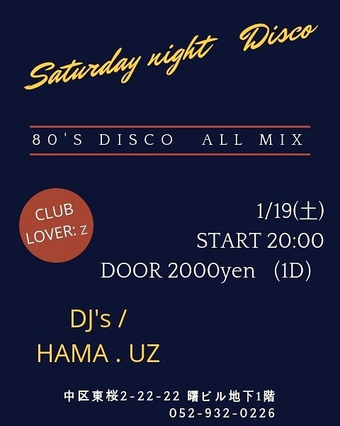 Saturday Night Disco 1/19(ÅÚ) START 20:00 DOOR 2000yen ¡Ê1D¡Ë DJ's / HAMA . UZ LOVER:£ú80s¡¢½é¤ÎÅÚÍËÆü³«ºÅ¡ª ±ýǯ¤ÎDISCO SOUND¤ò¡¢Åö»þ¤«¤é¸½ºß¤Þ¤Ç¡¢ ̾¸Å²°DISCO¤Ë·È¤ï¤Ã¤Æ¤¤¿¡¢¤³¤ÎÆó¿Í¤¬¡¢ ¥Õ¥í¥¢¤òÀ¹¤ê¾å¤²¤Þ¤¹¡ª Àä̯¤ÊÁª¶Ê¤ò¤ª³Ú¤·¤ß¤¯¤À¤µ¤¤¤Þ¤»¡ª ¾ì½ê¡§ CLUB LOVER:£ú ½»½ê¡§ ̾¸Å²°»ÔÃæ¶èÅìºù2-22-22 ½ì¥Ó¥ëÃϲ¼1³¬ ÅÅÏá§ 052-932-0226 ¡¡¡¡¡¡*Åì²£INN̾¸Å²°±É¤È¤Ê¤ê ÃÏ¿Þ https://goo.gl/maps/8TXgt3uTxAL2 ¡ú2·î¤Î¥é¥Ð¡¼¥º80s¤ªÃΤ餻¡ú ¡ú2/10¤Î¡¢Æü½ËÁ°¤Ç¤¹¡£ 80s DISCO NIGHT¤Ï¡¢Ìë¤Ë