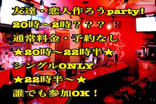 ★1.23(水)★ 平日 友達・恋人作ろうparty! 時間→20時〜2時??? (盛り上がり次第朝まで営業) 会場→CandyStrap 名古屋市中区栄5-6-4栄能楽ビル3F (052)228-8678 料金→1500円(1D+おつまみ付) 追加ドリンク500円〜 カラオケ1曲200円 ★予約なし!当日お好きな時間から参加OKです(^^) ★20時〜22時半まではシングルの方のみ。 22時半〜はカップルさんも参加OK!! ★毎回、お一人様やオフ会初参加の方が多い平日オフ会。 ビアンBARに行ってみたい方にもオススメです。 週末は仕事でなかなかイベントに参加できず、平日休みのお友達や出会いが欲