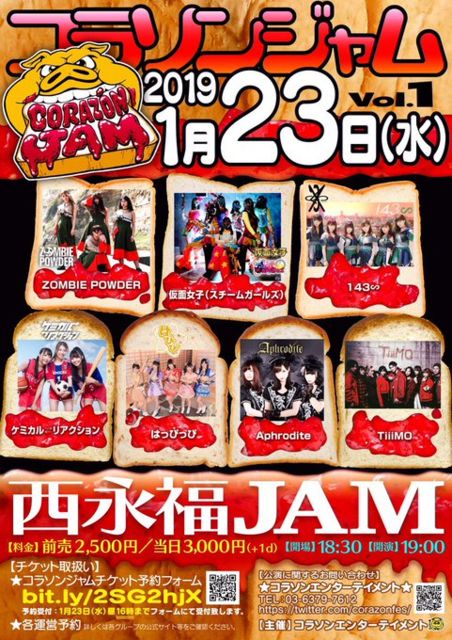 ¡Ö¥³¥é¥½¥ó¥¸¥ã¥àvol.1¡× Æü»þ¡§01/23(¿å) ³«¾ì18:30 / ³«±é19:00 ²ñ¾ì¡§À¾±ÊÊ¡JAM ÎÁ¶â¡§Á°Çä2,500±ß / ÅöÆü3,000±ß¡Ê£±DÊÌ¡Ë ½Ð±é¡§²¾Ì̽÷»Ò¡Ê¥¹¥Á¡¼¥à¥¬¡¼¥ë¥º/¥±¥ß¥«¥ë¥ê¥¢¥¯¥·¥ç¥ó/143¢æ/ZOMBIE POWDER/Aphrodite/¤Ï¤Ã¤Ô¤Ã¤Ô/TiiiMO