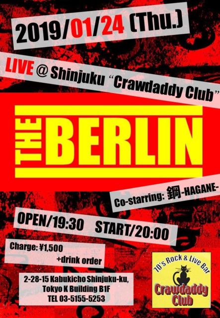 1/24 ËÜÆü¤Ï¥é¥¤¥Ö¤Ç¤¹¡ª THE BERLIN ¡õ ¹Ý(HAGANE) LIVE¡¡ ÀâÌÀ:OPEN 19:30 START 20:00 CHARGE 1500±ß¡¡ BERLIN LIVE ¥¹¥Ú¥·¥ã¥ë¥«¥¯¥Æ¥ë¡Ö¥É¥é¥¥å¥é¡×¤â¤¼¤Ò¤ª»î¤·¤¯¤À¤µ¤¤¡ª