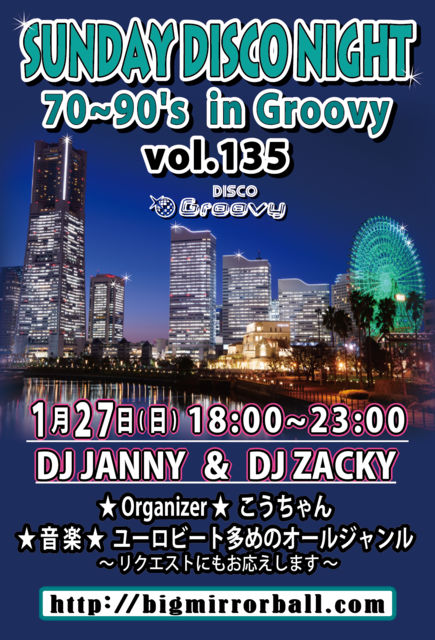 今月も第4の日曜日に開催となります【SUNDAY DISCO NIGHT 70~90's in Groovy】日曜日にしかお出かけできない方々など、休日でもDISCOなNIGHTを存分にお楽しみいただけます♬ 【オーガナイザー】こうちゃん 【DJ's】 JANNY(MAHARAJA ROPPONGI) / ZACKY 【音楽】ユーロビート多めオールジャンル (SOUL、竹の子、EURO、HI-NRG、R&B、etc... 皆様のリクエストにお応えします!) 【開催時間】 18:00〜23:00 【料金】 男性:¥2,500 / 2Drinks 女性:¥2,000 / 2Drinks