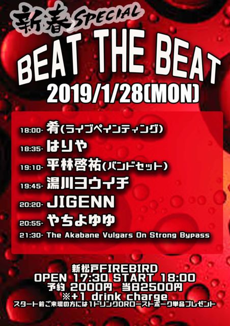 open/ 17:30 start/ 18:00 予約・前売/ ¥2,000+D代別 当日/ ¥2,500+D代別 (出演) JIGENN The Akabane Vulgars On Strong Bypass 平林啓祐(バンドセット) 湯川ヨウイチ やちよゆゆ はりや 肴(ライブペイント) DJ:Mr.Black ◎20:20から出演予定 ↓予約 http://jigenn.net/postmail/postmail0128.html
