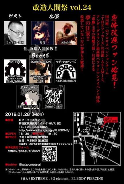 2019年1月28日(月) 歌舞伎町ロフトプラスワン OPEN 18:30 / START 19:30 予約¥3000/当日¥3500(飲食別) <予約受付> https://goo.gl/bF2wuV 身体改造ファン必見! 国内唯一のプロサスペンションチーム『THEフッカーズ』の首領・ASAMIと、アンダーグラウンド最高峰パフォーマンスイベント団体『毒蟲』主宰の残酷天使・月花による夢の狂宴!! 改造していない方の参加も大歓迎! 【出演】 月花 ASAMI 他、改造人間多数!! 【ゲスト】 ケロッピー前田 【BOOTH】 Tribal Tattoo APOCARIPT Taku Oshima(TATTOO) Scar