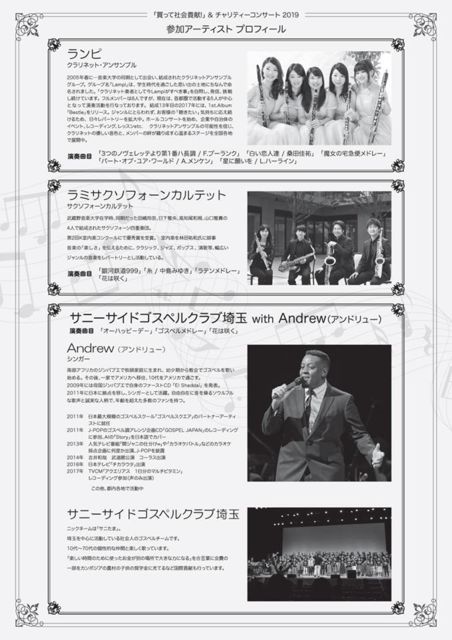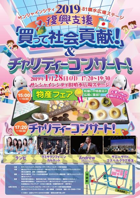 サニたま(サニーサイドゴスペルクラブ埼玉)です。 埼玉を中心に活動しております、社会人のゴスペルグループです。 このたに復興イベントに出演させて頂くことになりました!! このイベントは日立グループの社会貢献の一環として開催されるイベントです。 同じ会場内で復興支援のための物産フェアも開催されます。 オープンスペースなのでどなたでも観覧可能です。 みなさまのご来場お待ちしております!! ◇イベント名:「買って社会貢献!」&チャリティコンサート! ◇日程:2019年1月28日(月) 17時20分〜19時2