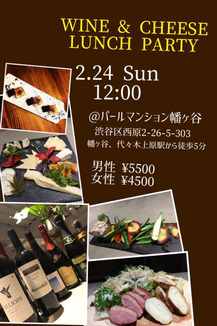 雪が降ったり降らなかったり… 寒いが続きますね。 そんな中、2/24の日曜日のお昼間に ワイン&チーズのランチパーティーを開催します! 厳選ワインとパンとデザート込みで、 料理は7品! そのうちチーズは、 厳選チーズ盛り合わせ(多分7種くらい) ラクレットチーズ料理、 クリームチーズやマスカルポーネチーズを使ったデザート もりもり出てくるランチ会です! ご興味あれば是非是非ご参加ください! ご都合合えば是非是非ご参加ください! 詳細はこちら! ・・・・・・・・・・・・・・・・・・・・ 開催日時:2/24