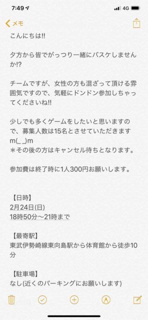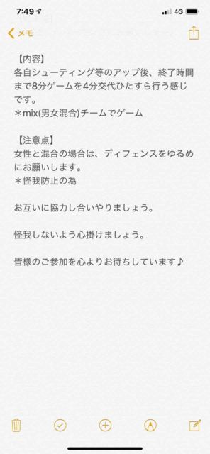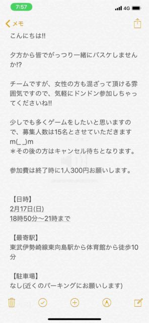 こんばんはナギと申します 次の日曜日に体育館が確保できたため、募集いたします。 基本的に皆で楽しむことを目的としておりますので女性や初心者のかたも歓迎いたします。 経験者の方ももちろん募集いたします。 『詳細』 ・場所 大田区区民プラザ地下一階 (下丸子駅から徒歩一分) ・時間 9時から12時です。 ・費用 500円です 9時から9時半まで各自アップ 9時半から10時まで全体アップ 10時から12時まで試合となっております。 『注意事項』 ・12時には完全撤収でお願いします ・体育館内は飲食禁