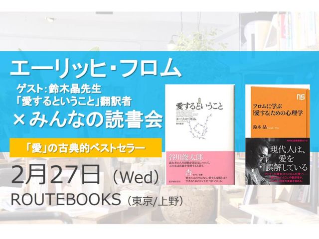 「愛は、誰もが生まれながらに持っているものではなく、学ぶべきものだ」 あなたは、この言葉にドキッとしましたか? エーリッヒ・フロム『愛するということ』は、日本でも多くの著名人や読者に読み継がれてきた名著。 今夜の「みんなの読書会」は、本著の翻訳者であり、1月に刊行された 『フロムに学ぶ「愛する」ための心理学』の著者である鈴木晶先生をゲストにお招きし 「愛」について語り合います。 いまだからこそ、読み価値がある。 ぜひご参加ください! ※会場には限りがございます。 上限数に達した場合はお申込みを締め切ら