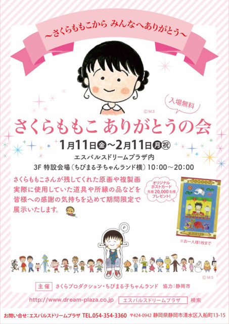 2019年新春さくらももこ先生オフ会(コジコジ&ちびまる子ちゃん) を2月8日(金)夜7時から、杉並区のコジコジカフェ(仮)にて開催します。 さくらももこ先生の作品、コジコジやちびまる子ちゃんについて、 ファン同士が、気さくに見たり聞いたり話したりできる会になればと思います。 簡単なお食事つき飲み物付き1500円夜7時から9時か10時くらいまで。 写真はただいま開催中の、ちびまる子ちゃんランドのイベントの告知のものです。