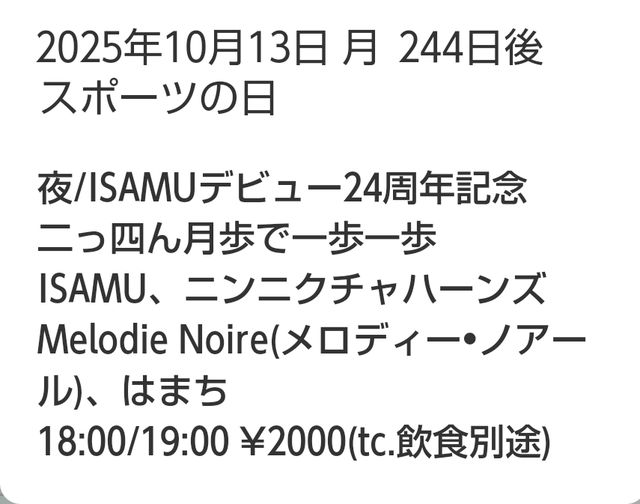 Ëèǯ¹±Îã¤Î¼«¿È¤Î¥Ç¥Ó¥å¡¼¼þǯµ­Ç°Æü¥é¥¤¥Ö¤ò±ï¤Î¤¢¤ë¥Ð¥ó¥Éã¤ò¾·¤­º£Ç¯¤â³«ºÅ¡£ ▢10/13¡Ê·î½Ë¡Ë "°ìÊÓÆþº²·¿»íŪɽ¸½¼ÔISAMU ¥Ç¥Ó¥å¡¼24¼þǯµ­Ç°¥é¥¤¥Ö" ÂêÌÜ: Æó¤Ã»Í¤ó·îÊâ¤Ç°ìÊâ °ìÊâ ¾ì½ê: º£Ãӡ֥ѥé¥À¥¤¥¹¥«¥Õ¥§21¡× http://paradisecafe21.nagoya ½»½ê: °¦Ãθ©Ì¾¸Å²°»ÔÀé¼ï¶èº£ÃÓ1-8-5 º£ÃÓ¥¿¡¼¥ß¥Ê¥ë¥Ó¥ëB1F ÅÅÏÃ: 052-741-8566 ¸òÄÌ: ̾¸Å²°»Ô±ÄÃϲ¼Å´Å컳Àþ¡¦ºùÄÌÀþ¡Öº£ÃÓ¡×10Èֽиý¤è¤êÅÌÊâ1ʬ¡£(º£ÃÓ¥¬¥¹¥Ó¥ëÀ¾ÎÙ¡£¢¨º£ÃÓ¥¬¥¹¥Ó¥ë¤ÎÃϲ¼³¬¤«¤éľ·ë) »þ´Ö: 18»þ³«¾ì/19»þ³«±é ÎÁ¶â: 2000±ß(TC¡¦°û¿©ÊÌÅÓ) ½Ð±é