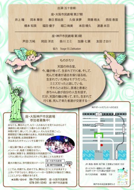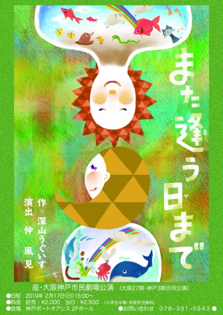 市民が作る!一期一会の世代間交流ステージ 出演者の9割が演劇未経験!半年間の集大成♪ 座・大阪神戸市民劇場「また逢う日まで」が2019年2月17日(日)に兵庫・神戸ポートオアシスにて上演 *あらすじ ここは天国の待合室。今、鐘が鳴って、生まれて行く者、そして、死んだ者たちが過去を振り返るところ。生きていた時は、モグラだった、ミミズだった、と話している。 ………それとは別に、医者と患者・赤ちゃんたちが自分の人生を話す。 だが、天国の鐘は鳴って、また生まれていくもの、死んできた者達が交差する……。 生きていく事の尊