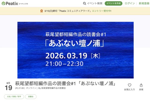 ³§¤µ¤ó¤³¤ó¤Ë¤Á¤Ï¡ª¡¡¡¡ÇëÈøË¾ÅÔ¤ÎûÊÔ¤¬Âç¹¥¤¤Ç¡¢µ¤·Ú¤Ë´¶ÁÛ¤ò¸ì¤ê¹ç¤¤¤¿¤¤¤È»×¤¤¡¢¥ª¥ó¥é¥¤¥óÆÉ½ñ²ñ¤ò»Ï¤á¤Þ¤·¤¿¡£ ¼çºÅ¤¬Áª¤ó¤À²ÝÂêûÊÔ1¤Ä¤ò¡Ö»öÁ°¤ËÆÉ¤ó¤Ç¤«¤é¡×Zoom¤Ç»²²Ã¤·¤Æ¡¢ºîÉʤδ¶ÁÛ¤òµ¤·Ú¤Ë¸ì¤ê¹ç¤¦¡¢¤æ¤ë¤ä¤«¤ÊÊ·°Ïµ¤¤Î²ñ¤Ç¤¹¡£ Âè°ì²ó¤Î²ÝÂêºîÉʤϡ¢1993ǯ¤Î¡Ö¤¢¤Ö¤Ê¤¤Ãťαº¡×¤Ç¤¹¡£ ¡ÚÆü»þ¡Û2026ǯ3·î19Æü¡ÊÌÚ¡Ë21:00¡Á22:30º¢¡Ê±äĹ¤Î²ÄǽÀ¤¢¤ê¡Ë ¡Ú·Á¼°¡ÛZoom¥ª¥ó¥é¥¤¥ó¡Ê¥«¥á¥éON¿ä¾©¤Ç¤¹¤¬¥ª¥ÕÏÈ1̾¸ÂÄꤢ¤ê¡Ë ¡ÚÄê°÷¡Û6̾¤¯¤é¤¤¡Ê¾¯¿Í¿ô¤Ç¤æ¤ë¤¯´¿ÃÌ¡Ë ¡Ú»²²ÃÈñ¡Û̵ÎÁ ¡Ú»²²Ã¾ò·ï¡Û»öÁ°¤Ë¡Ö¤¢¤Ö¤Ê¤¤ÃÅ¥Î