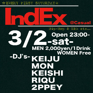3/2-sat- INDEX OPEN 23:00 MEN 2,000yen/1Drink WOMEN Free -HIP HOP,R&B- -DJ's- KEIJU MON KEISHI RIQU 2PPEY