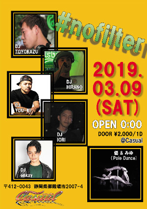 3/9-sat- nofilter OPEN 00:00 DOOR 2,000yen/1Drink -DJ- YOU-KI TOYOKAZU HIRANO IORI emkay -Pole Dance- Í¥ ¤ß¤æ