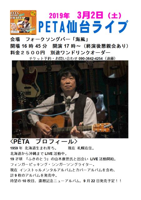 PETAさん来仙に合わせて、3月1日誕生日のてふひろと3月生まれのひさはな村長、5人のバーステー歌会をします。 歌会は、てふのために皆さんが歌ってくれる会です。歌わない方も参加できます。 以下の内容で行います。 日時 3月2日(土)16時45分〜受付 17時〜 PETAさんツアーライブ 19時〜20時半 お誕生会 (てふのために歌ってください) 参加費 チケット2500円と別途ワンドリンク〜 20時半まで4時間完全貸し切りですが、21時から通常営業になります。