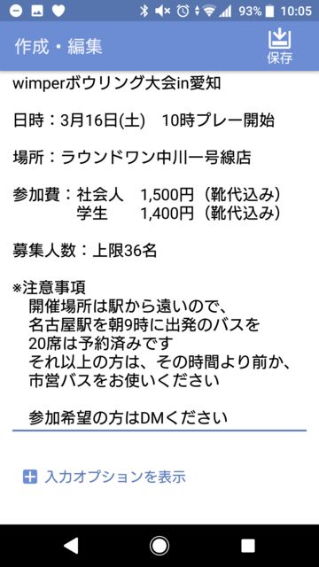 Twitterで同じ募集をかけてます 各地で、フットサルや運動会をやってるのを見て 愛知も何かやりたいと思い ボウリング大会を開催することにしました 日時:3月16日(土) 10時プレー開始 場所:ラウンドワン中川1号線店 参加費:社会人 1500円(靴代込み) 学生 1400円(靴代込み) ゲーム数:2G 募集人数:30名 ※Twitterと同時募集のためmixiの人数が少なくても募集を締め切ることがあります 名古屋駅を9時発のラウンドワンバスを 20席予約してありますが、先着順とさせてもらいます 乗れない方は、9時より前のバス