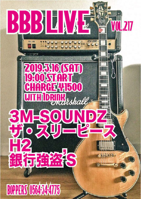 BBB LIVE 217 2019.3.16 (SAT) 19:00 START CHARGE \1500 with 1drink 3M-SOUNDZ ザ・スリーピース H2 銀行強盗'S