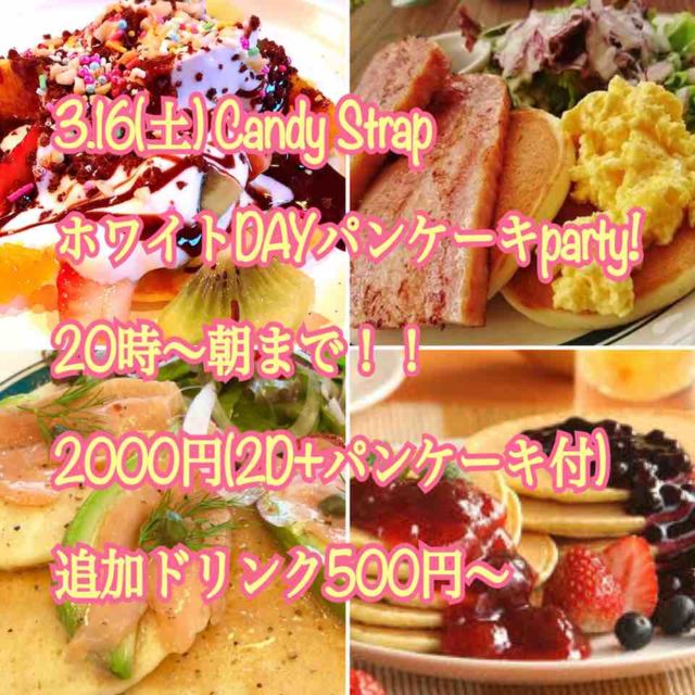 ★3.16(土)★ ホワイトDAYパンケーキparty! みんなで仲良くパンケーキ食べよ(^^) トッピングいろいろ用意します! 甘い物が苦手な方は食事系パンケーキもあるよ! お一人様や初めましての方も大歓迎! この機会にBARデビューしてみませんか? 当日お好きな時間にお店に来てくれればOKです! お友達や出会いが欲しい方は、ぜひ遊びに来て下さいね(^^) ★時間→20時〜朝まで! ★料金→2000円(2D+パンケーキ付) 追加ドリンク500円〜 ★ホワイトDAY限定カクテルあるよ(アルコール・ノンアルコール各600円) ★会場→Candy Strap 名古屋市中区栄5-6-4栄