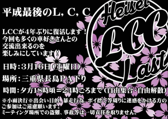 【イベント告知】 ❣ 年末出来なかったので....... 🔔【平成最後のL.C.C.】🔔 L.C.C.が4年ぶりに復活します🤗🤗 今回も多くの車好きさんとの交流出来るのを楽しみにしています😉💫 今回の詳細は、 ✨日程✨ 3月16日【土曜日】 ✨場所✨ 三重県長島PA下り ✨時間✨ 夕方18時ごろより〜深夜24時くらいまで(自由集合・自由解散) 🚘🚘車種🚘🚘 オールジャンル 車好きさん同士で集まっていろんな交流が