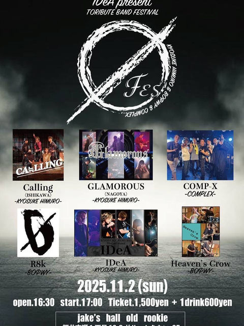 IDeA presents Tribute band festival Ø Fes 2025.11.2(Sun) Jake’s hall old rookie 福井市順1-10-9 ドリームタウン3F https://www.oldrookie2020.com Open 16:30 Start 17:00 Charge1,500円&1Drink\600 Cast: IDeA(福井)氷室京介 GLAMOROUS(愛知)氷室京介 Heaven’s Crow(福井)BOØWY COMP-X(福井)COMPLEX Calling(石川)氷室京介 R8k(福井)BOØWY