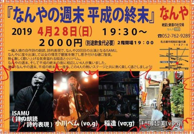 ¤â¤¦Ä¾¤°Ê¿À®¤¬½ª¤ï¤í¤¦¤È¤·¤Æ¤¤¤Þ¤¹¡£ 2001ǯ¤Ë³èư¤ò»Ï¤á¤Æ18ǯ´Ö¤ÇºÇ¤â¥é¥¤¥Ö¤ò±é¤é¤»¤ÆÄº¤¤¤¿¤Î¤¬¸æ´ï½ê¡Ö¤Ê¤ó¤ä¡×¤µ¤ó¡£ ¸æ´ï½ê¡Ö¤Ê¤ó¤ä¡×¤Î½µËö(Ëè½µ·îÍËÆü¤¬ÄêµÙÆü)¤ËÊ¿À®ºÇ¸å¤Î¥é¥¤¥Ö¤ò³«ºÅ¡£ ¢¢4/28(Æü) ¡Ø¤Ê¤ó¤ä¤Î½µËö Ê¿À®¤Î½ªËö¡Ù ¾ì½ê: ¸æ´ï½ê¡Ö¤Ê¤ó¤ä¡×̾¸Å²°»Ô¾¼Ï¶è±öÉÕÄÌ1¡¾47¡¾4 ¸òÄÌ: Ãϲ¼Å´ÄáÉñÀþ¡¦ºùÄÌÀþ¡Ö¸æ´ï½ê¡×1Èֽиý¤è¤êÅÌÊâ5ʬ¡£ »þ´Ö: 18»þ³«¾ì(2³¬³«¾ì19»þ)/19»þȾ³«±é(22»þ½ª±éͽÄê) ÎÁ¶â: 2000±ß(ÊÌÅÓ°û¿©Âå) ½Ð±é: ISAMU ¾®Àî¥Ù¥à °ð¤ Èõ¸ýÃÒÈþ °ìÊÔÆþº²¤Î¼«ºî»í¤ÎϯÆÉ/»íŪɽ¸½¤Ç¡¢¤Ê¤ó