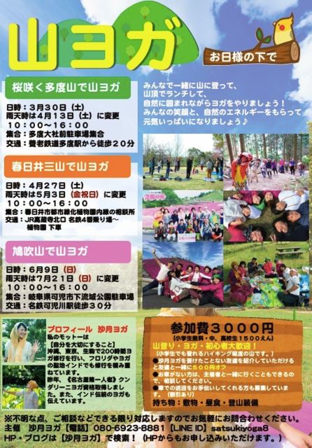 ¡Ú»³¥è¥¬in½ÕÆü°æ»°»³¡ÊÌïðÕ»³¡Ë¡Û ³§¤µ¤ó¡¢¤³¤ó¤Ë¤Á¤Ï¡ª½Õ¤Ë¤Ê¤ê¤Þ¤·¤¿¤Í¢ö¢ö ½Õ¤ÎÆüº¹¤·¤ò´¶¤¸¤Ê¤¬¤é¤¬¤é¡¢»³¥è¥¬¤·¤Þ¤»¤ó¤«¡© Â缫Á³¤ÎÃæ¤Ç³§¤µ¤ó¤Ç¿´¤â¿ÈÂΤ⡢µ¤»ý¤Á¤è¤¯¿¤Ð¤·¤Þ¤·¤ç¤¦(*^^*)¢ö »³¤¬¡¢Âç¹¥¤¡ª¡ª ¤½¤·¤Æ¡¢¼«Ê¬¤Î¿´¡¢¼«Á³¤È¤È¸þ¤¹ç¤¦¤³¤È¤¬Âç¹¥¤¤Ê¥á¥ó¥Ð¡¼¤Ç¤¹¡ù [»³¥è¥¬¤Î¼Ì¿¿¤Ï¤³¤Á¤é] http://satukiyoga.wixsite.com/yoga-instructor/photo2 ¡ÎÆüÄø¡Ï 4·î27Æü(ÅÚ) ±«Å·¤Î¾ì¹ç¤Ï¡¢5·î£³Æü¤ËÊѹ¹¤Ç¤¹¡£ ¡Ú¹Ô¤Àè¡Û ½ÕÆü°æ»°»³(ÌïðÕ»³)¡¡¡¡437¥á¡¼¥È¥ë ¡Ú¥¿¥¤¥à¥¹¥±¥¸¥å¡¼¥ë¡Û 9:50¡Á