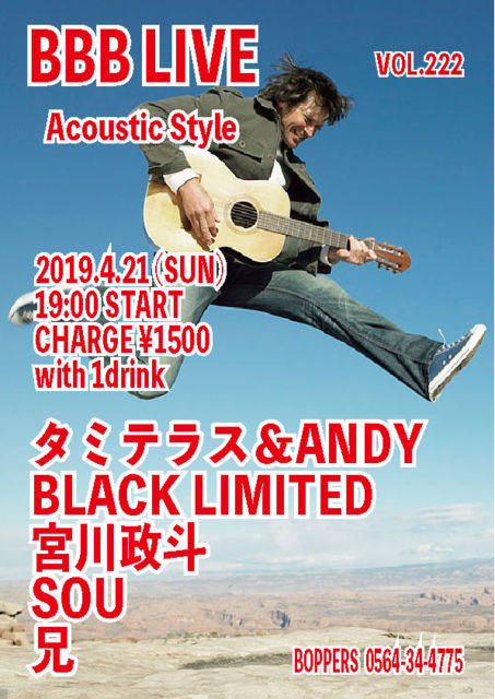 BBB LIVE 222 Acoustic Style 2019.4.21 (SUN) 19:00 START CHARGE \1500 with 1drink ¥¿¥ß¥Æ¥é¥¹¡õANDY BLACK LIMITED µÜÀîÀ¯ÅÍ SOU ·»