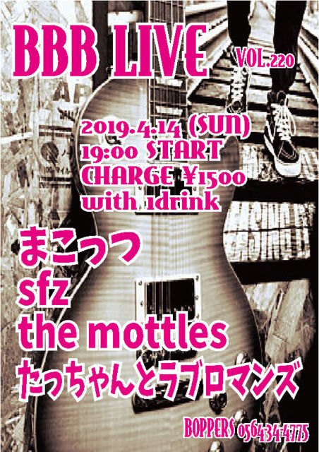 BBB LIVE 220 2019.4.14 (SUN) 19:00 START CHARGE \1500 with 1drink ¤Þ¤³¤Ã¤Ä sfz the mottles ¤¿¤Ã¤Á¤ã¤ó¤È¥é¥Ö¥í¥Þ¥ó¥º