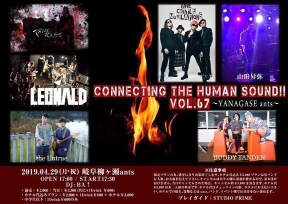 2019年4月29日(月) 岐阜yanagase ants ◆Connecting the human Sound!! vol.67◆ 【出演】 THE CATTLE MUTILATIONS LEONALD BUDDY TANDEN the Unturue 山田昇弥 PIXIE ROUGE 【DJ】 BA↑ OPEN17:00/START17:30 TICKET:adv2000yen/door2500yen (入場時ドリンク代別途必要です) ※ホテル代込みチケットは+3000yen 限定プランの為、満室になり次第終了となります PIXIE ROUGEは6組中6番目21:15〜の出演予定です 岐阜yanagase ants:岐阜市柳ヶ瀬通7-4柳ヶ瀬観光ビルB1F