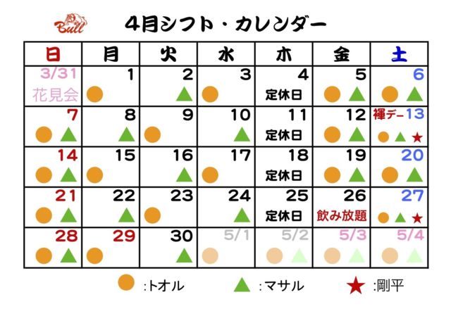光陰矢の如し3月も去り明日から4月ですね〜 4月営業予定 毎週の平日(月・火・水)9時までお得な早割 2,000円 ショットコース 3杯+お通し ボトルキープコース 割物フリー+お通し ボトルキープ千円引き 第2土曜日恒例の褌デー 4月13日(土) 17時より21時まで褌オンリー 21時以降着衣もオッケーです。 マサル、トオル、剛平がまったりとお待ちしております。 飲み放題 4月26日第4金曜恒例の焼酎・泡盛、ソフトドリンク2千円飲み放題です。 食べ物持ち込み自由で楽しく飲みましょう。