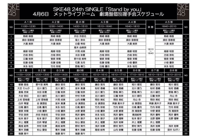 皆さま、日ごろより熊崎晴香さんへの応援ありがとうございます。 2019年4月6日(土)に開催されます SKE48 24th シングル「Stand by you」 (劇場盤)個別握手会 @メットライフドームにおいて 熊崎晴香さんのファンミーティングを行います。 =============================== ■開催時間:14時00分(予定) くまちゃんが参加する握手会の部は ・A1部・・・・11:00~12:30(12:10受付終了) ・A2部・・・・12:30~14:00(13:40受付終了) ・A3部・・・・15:10~16:40(16:20受付終了) ・A4部・・・・16:40~18:10(17:50受付終