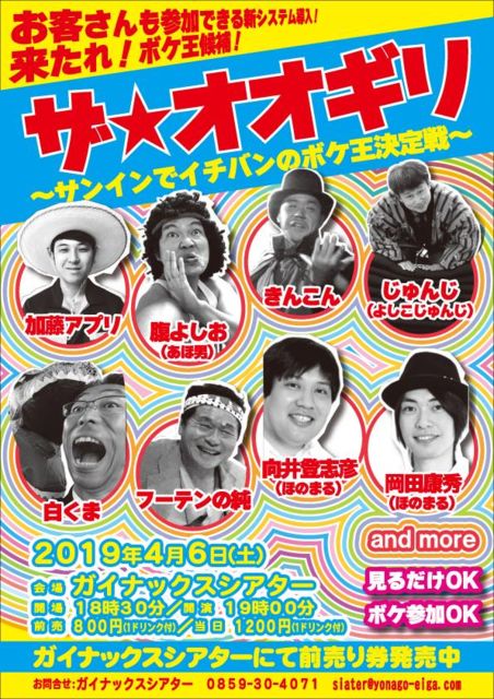 ほのまるさんイヴェント出演のお知らせです。 『ザ・オオギリ〜サンインでイチバンのボケ王決定戦〜』 【日時】 2019年4月6日(土) 開場 18時30分/開演 19時 【会場】 ガイナックスシアター 鳥取県米子市末広町311 イオン米子駅前店3F http://gainaxsiater.yonago-eiga.com/ 【出演】 ほのまる向井 ほのまる岡田 加藤アプリ 腹よしお (あほ男) きんこん じゅんじ (よしこじゅんじ) フーテンの純 白くま 【料金】 前売 800円/当日 1,000円 (共に1ドリンク付) お客さんも参加できます。 http://