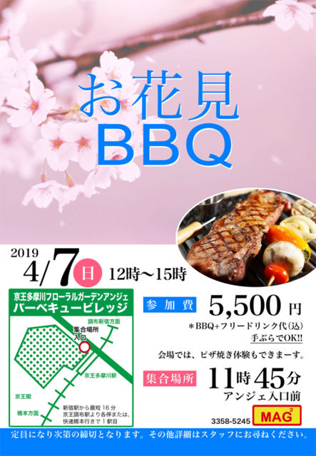 桜開花予報も発表になり、ようやく春間近になってきましたね! さて、京王多摩川フローラルガーデン・アンジェ・バーベキュービレッジ にて、お花見&BBQをおこないます。 暖かい春の日差しの中で横目に桜を見ながら、みんなでバーベキューを楽しもう! 植物園の中にチェリーガーデンもあるよ〜ん。 会場では、ピザ焼き体験もできます。 ぜひぜひ、お誘い合わせの上ご参加くださーい。よろしくお願いします。 ●開催日時 2019年4月7日(日曜(12時〜15時)) ●場所は、京王多摩川・京王フローラルガーデン・アンジェ・バーベキュー