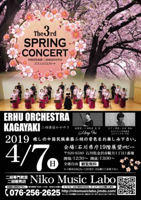 約50名の団員が所属する中国民族楽器二胡楽団かがやき♪金沢市が一望できる会場で、癒しの音色をお楽しみ下さい。 お近くの方は是非ご来場下さい♬ 開催日:2019年4月7日(日) 会 場:石川県庁展望19Fホール 〒920-8580 石川県金沢市鞍月1-1 開 場:12:30〜 開 演:13:00〜  観覧無料 楽団総監督:二胡奏者 孟 菲 Fei Meng ピアノ伴奏:太田 智加 https://www.facebook.com/events/2099247006823437/?ti=ia