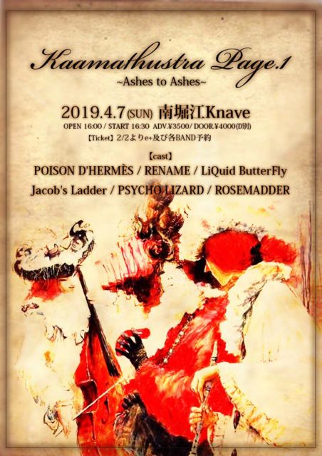 ◆2019/4/07(sun) 南堀江 Knave Kaamathustra Page.1 〜Ashes to Ashes〜 出演: POISON D'HERMÈS RENAME LiQuid ButterFly Jacob's Ladder PSYCHO LIZARD ROSEMADDER   開場 16:00 / 開演 16:30 前売 ¥3,500(+1d) / 当日 ¥4,000(+1d)  会場はこちら↓↓↓ http://www.knave.co.jp 予約はこちら↓↓↓ rosemadder2017@gmail.com ご予約の際は、ライブの日程・お名前(ふりがな)・枚数の明記をお願いいたします。