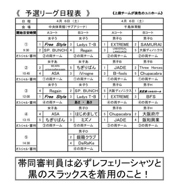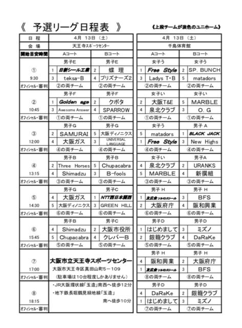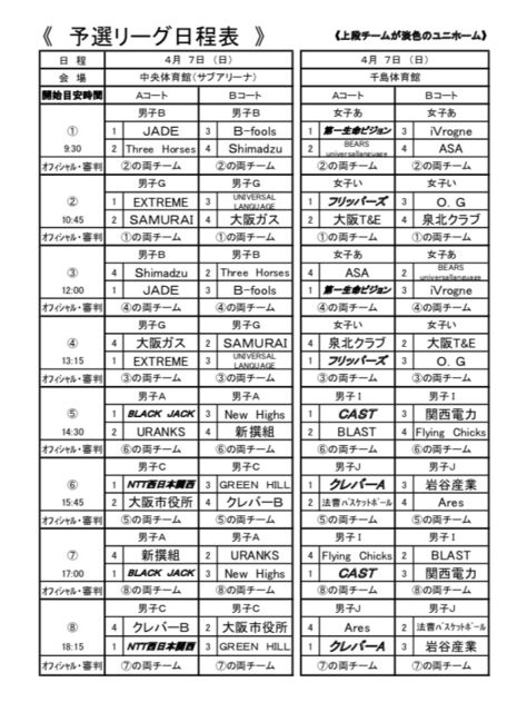4月7日(日)13時45分集合、中央体育館 前オフィシャル【Bコート】 15時45分〜GREEN HILL vs クレバー 18時15分〜大阪市役所 vs GREEN HILL 4月13日(土)13時45分集合、天王寺スポーツセンター【Bコート】後オフィシャル 14時半〜NTT西日本 vs GREEN HILL