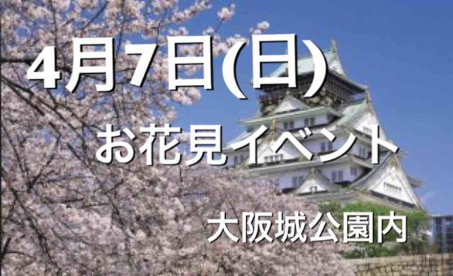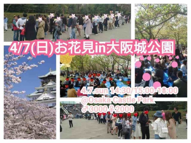4月7日に、大阪城公園にてお花見イベントします。 すでに40名くらい参加頂いておりまして、定員も近いです。 男女は半々の予定で現在少し女性が多くなっております。 参加費は男性2000円、女性1000円で別途ドリンク代になります。 詳細につきましてはご連絡頂きましたらお知らせ致します。 お友達探しや恋人探し、いろんな出会いがあると思います。 総勢五十人前後で男女半々の予定です。 世代は男女ともに20-30代です。 参加希望、詳細知りたい方はコメントください。 ※マルチ商法、宗教の勧誘はご遠慮下さい。 ※過度の泥酔者に