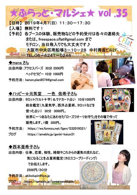 C Flatでは4月7日(日)に今年2回目のふらっと・マルシェを開催します! 新しい出展者さんもいらっしゃるので是非お越しください〜。 ★★★ふらっと・マルシェ4月7日の出展者様ご紹介★★★ 【日時】 2019年4月7(日) 11:30−17:30 【入場】 無料です! 【予約】 各ブースの体験、販売物などの予約受付は各々の連絡先 または、freespace.cflat@gmail.com まで モチロン、当日飛入りでも大丈夫です♪ 大阪市中央区南船場3−10−28 中村興産ビル2F TEL:06−6241−0246 ht