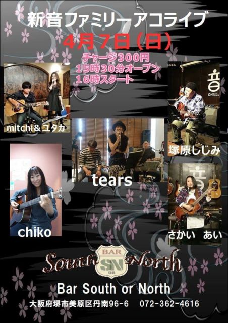 【新音ファミリー★アコライブ】 Open 15:30 Start 16:00 チャージ 300円 @Bar South or North 大阪府堺市美原区丹南96-6 【出演順】(敬称略) 1 さかい あい 2 chiko 3 塚原しじみ 4 mitchi &ユタカ 5 tears ********** 主催メンバーのmitchiさんのメッセージです(((o(*゚▽゚*)o)))↓↓↓ すご〜く素敵な出演者のみなさまです めっちゃ盛り上がること間違いなしです めちゃめちゃ楽しみです みんな遊びに来てね〜(^○^)❣ ********** 夕方16時スタート