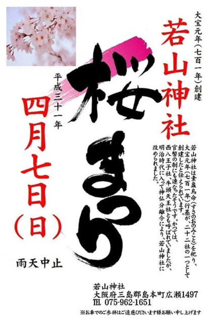 若山神社さくら祭り 2019年4月7日(日) 10:30〜11:00 シャンテ 11:00〜11:30 井垣志穂 11:30〜12:00 THE SOUTHPARKING 12:00〜12:30 天野亜利沙×奥野和憲 12:30〜13:00 小林万里子 13:00〜13:30 高橋バンド 13:30〜14:00 ちゃぷらす 14:00〜14:30 むじかとれす 14:30〜15:00 チーム恵美之助 昨年も呼んでいただいた島本町・若山神社の「桜まつり」に今年も出演させていただきます。 「桜まつり」といいながら、雪が降ったり、桜が咲いてなかったりとまんの悪いことが続いていたそうですが、 昨年はまぁないことに満開の桜の下での開催と