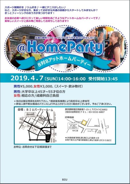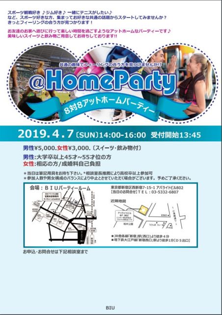 £¸ÂУ¸¡÷¥Û¡¼¥à¥Ñ¡¼¥Æ¥£¡¼ Æü»þ 2019ǯ04·î07Æü(Æü)¡¡14:00¡Á16:00¡Ê¼õÉÕ13:45¡Á¡Ë ¾ì½ê BIU¥Ñ¡¼¥Æ¥£¡¼¥ë¡¼¥à¡Ê¿·½É¶è¡Ë »²²ÃÈñ ÃËÀ¡§\5000¡¡½÷À¡§\3000 ÂÐ¾Ý ÃËÀ¡§Âç³ØÂ´°Ê¾å45ºÍ¡Á55ºÍ¤Þ¤Ç¤ÎÊý¡ÊÁêÃ̼¼¿äÁ¦¤Ë¤è¤ê¹â´°Ê¾å²Ä¡Ë ½÷À¡§Áê±þ¤ÎÊý¡ÊÀ®º§ÎÁ¼«¸ÊÉéô½ÐÍè¤ëÊý¡Ë Äê°÷¿ô ÃËÀ8̾ ½÷À8̾ ÆâÍÆ ¥¹¥Ý¡¼¥Ä´ÑÀï¹¥¤¢ö¥¸¥à¹¥¤¢ö°ì½ï¤Ë¥Æ¥Ë¥¹¤¬¤·¤¿¤¤¢ö¤Ê¤É¡¢¥¹¥Ý¡¼¥Ä¤Î¹¥¤¤ÊÊý¡¢½¸¤Þ¤Ã¤Æ¤ª¹¥¤¤Ê¶¦Ä̤ÎÏÃÂ꤫¤é¥¹¥¿¡¼¥È¤·¤Æ¤ß¤Þ¤»¤ó¤«¡©¤¤Ã¤È¥Õ¥£¡¼¥ê¥ó¥°¤¬¹ç¤¦Êý¤¬¸«¤Ä¤«¤ê¤Þ¤¹¡ª ¤ªÍ§Ã£¤Î¤ª²È¤ØÍ·¤Ó¤Ë¹Ô¤Ã¤Æ³Ú¤·¤¤»þ´Ö¤ò²á