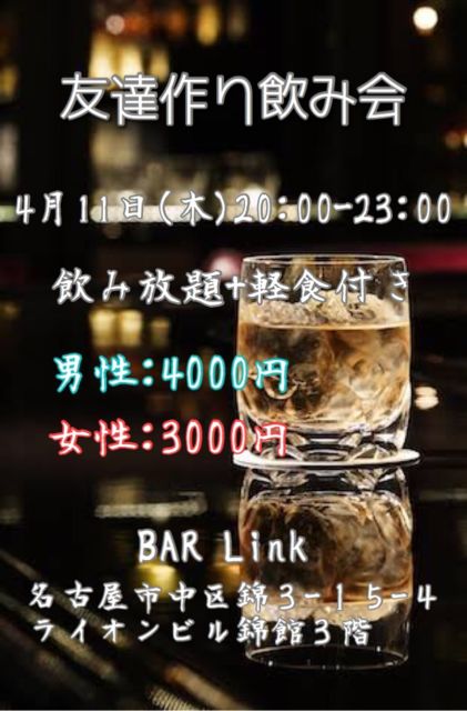 【友達作り飲み会】 こんにちは 栄のオシャレなBARで20人飲み会開きます ・友達が欲しい方 ・お酒が好きな方 ・ダーツが好きな方 ・カッコイイバーテンダーさんと会いたい方 ・新しい趣味が欲しい方 そんな方にオススメです! 日時 4月11日(木) 受付19:45〜 開始20時~23時迄 参加費 ドリンク飲み放題+軽食 (ソフトドリンクも有り) 男性:4000円 女性:3000円 (イベントチームULVISの割引を持ってる方は使えます!) 場所 BAR Link 愛知県名古屋市中区錦3−15−4 ライオンビル錦館3