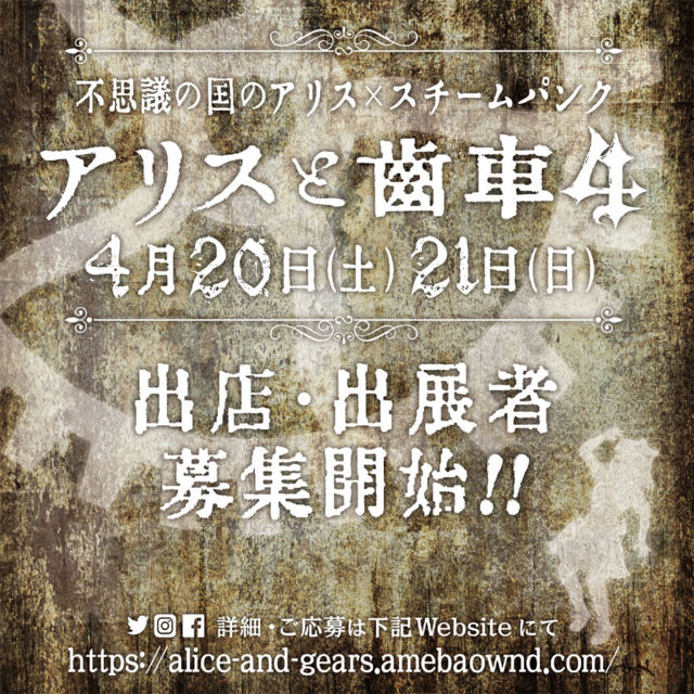 不思議の国のアリス × スチームパンク ハンドメイドマーケット・公募作品展・他 関西最大級のアートイベント 「アリスと歯車4」今春開催!! ●開催日時 2019年4月20日(土)・21日(日) 両日とも11:00〜18:00 ●開催場所 大阪市立西成区民センター 557-0041 大阪市西成区岸里1丁目1-50 ●入場料(1日・再入場可) 大人(中学生以上)500円 小人(小学生以上)250円 幼児(5歳以下)無料 ※R-15指定:15歳未満、保護者同伴にて入場可 〜募集内容〜 ●ハンドメイドマーケット のべ64ブース募集(予定) ・2日間出店(