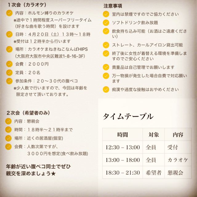 拝啓HAP(腹ペコ)殿 皆さま、新しい曲でヘドバンしませんか? 皆さま、注文した新しいTシャツを着て一緒に汗をかきませんか? 一緒に、歌おう。暴れよう。これからの麺カタコッテリの話をしよう! ということで、ホルカラやります。 ★1次会(カラオケ)★ 内容:ホルモン縛りのカラオケ 日時:4月20日(土)13時〜18時 場所:カラオケまねきねこ なんばHIPS店 会費:1000円 定員:10名 参加条件:なし! ★2次会(希望者のみ)★ 内容:懇親会 時間:18時半〜21時半まで 場所:近くの