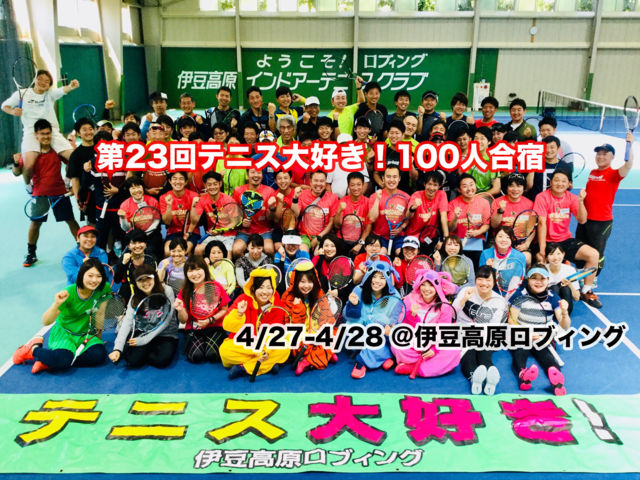 【第23回 テニス大好き!100人合宿!】 テニス大好き!100人合宿の季節がやってきました 今回で23回目となるテニス大好き!の公式イベント。 今年もテニス大好き!な参加者で2日間、オンコートも宴会も前のめり気味で楽しみましょう! SNS映えする恒例マグロ一本食べまshowも開催予定です♪ 毎年、満員御礼になる人気イベントですので、正式エントリーはお早めに! 【重要】 イベントの参加ボタンをぽちっと押しただけでは、正式参加になりません。 必ず、下記の応募フォームから