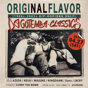 4/27-sat- ORIGINAL FLAVOR THE GOTEMBA CLASSICS OPEN 22:00 2,000yen/1Drink -90's HIP HOP,R&B ONLY- -DJ- AZUSA KEIJU MASUKE KINGDAAM Xuns JACKY -FOOD- CURRYTHE BOMB