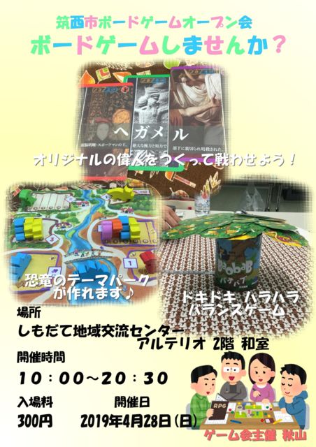 4/28の筑西市ボードゲームオープン会、ボードゲームしませんか?開催のお知らせです。 途中参加、途中退室OK。 ボードゲーム初経験者様大歓迎。 ※会場内での飲食につきまして パン、おにぎりなどの軽食類に関しては、ご自由にお持ち込み頂き、お食事をお願い致します。 カップラーメン、お弁当などのお持込に関しては、ご遠慮頂きます。 また、会場施設の一階にカフェがございます。 または、こちらで適当にスティックパンなどを準備いたしますので、ご食事下さい。 ※車ご利用について 会場施設に専用の駐車場がございます。 駐車券を受