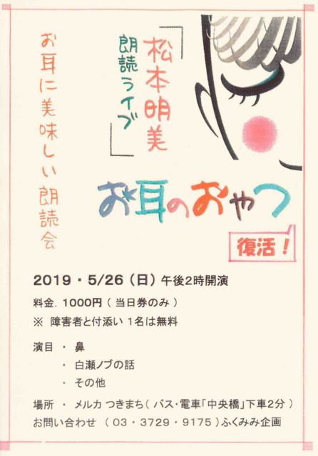 松本明美 朗読ライブ「お耳のおやつ」復活‼ 2019年5月26日 (日)メルカつきまち 朗読家・松本明美による朗読会のお知らせです。 笑いあり、感動ありと、聴く人の心を掴んで離さない素敵なひと時を楽しんで下さい。 【演目】「鼻」「白瀬ノブの話」その他 【日時】5/26(日)14:00開演 【場所】メルカつきまち(長崎市築町3-18) 【料金】1000円(当日券のみ) ※障がい者と付き添い1名は無料 ふくみみ企画 ☎03-3729-9175