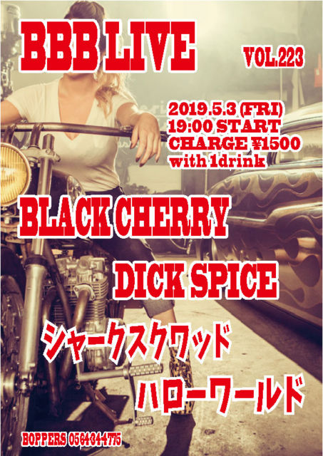 BBB LIVE 223 2019.5.3 (FRI) 19:00 START CHARGE \1500 with 1drink BLACK CHERRY DICK SPICE ¥·¥ã¡¼¥¯¥¹¥¯¥ï¥Ã¥É ¥Ï¥í¡¼¥ï¡¼¥ë¥É